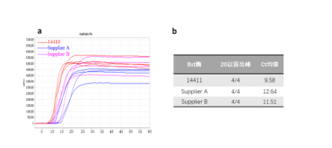 以非洲猪瘟DNA为模板,添加量为1ng/T,各厂家Bst单酶搭配各自buffer体系,翌圣 Bst酶14411扩增Ct值均小于Supplier A和Supplier B,表明14411扩增速度更快。