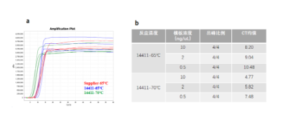 以gDNA为模板,搭配翌圣13762的buffer体系,考察14411在65℃和70℃的扩增能力。图a添加量为2ng/uL的模板,图b模板浓度梯度降低,结果表明:14411可耐受70℃的LAMP反应,且提高温度,检测Ct值显著缩小,耐热bst酶可进一步提升体系的灵敏度。